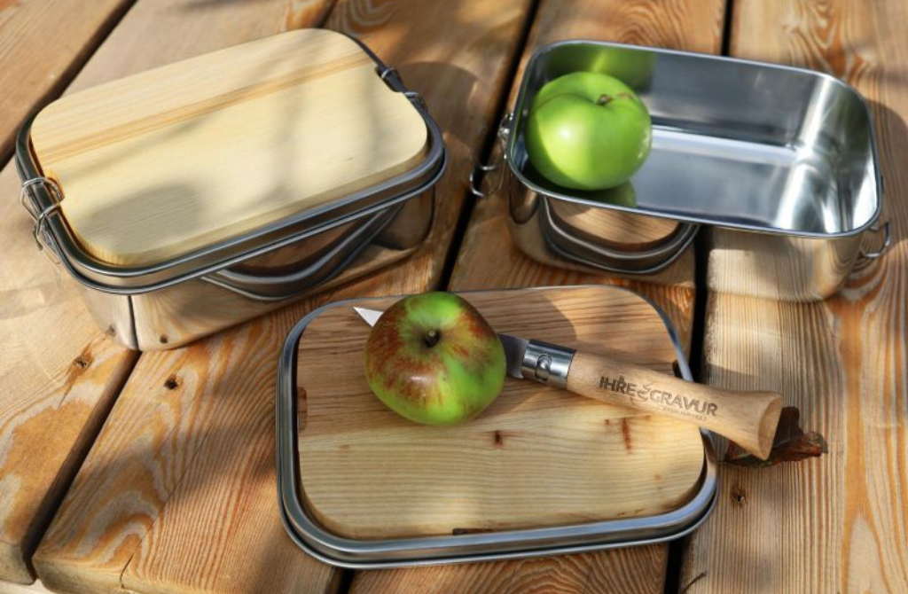 Holz ist nicht das einzige Material, das uns von Plastik befreit. Auch Edelstahl und Glas sind hervorragende Alternativen. Edelstahl ist perfekt für Rührschüsseln und Schneidwerkzeuge, da es robust, rostfrei und leicht zu reinigen ist. Glas eignet sich ideal für die plastikfreie Aufbewahrung. Wie die Znünibox aus Edelstahl mit Holzschneidebrett für unterwegs.