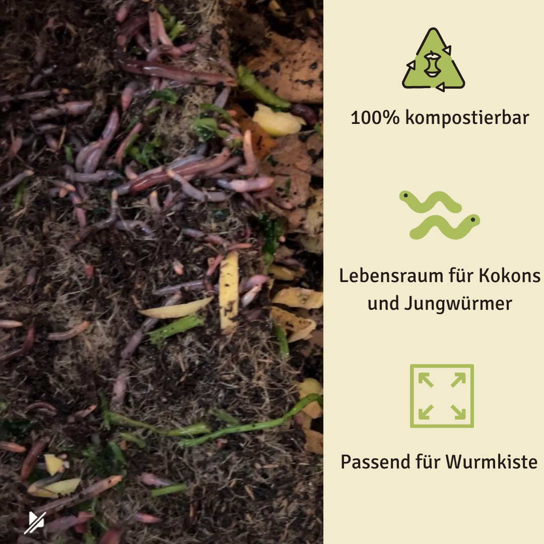 Zudem wird die Kokosmatte von den Würmern als Brutstätte genutzt und als Faserfutter verspeist.