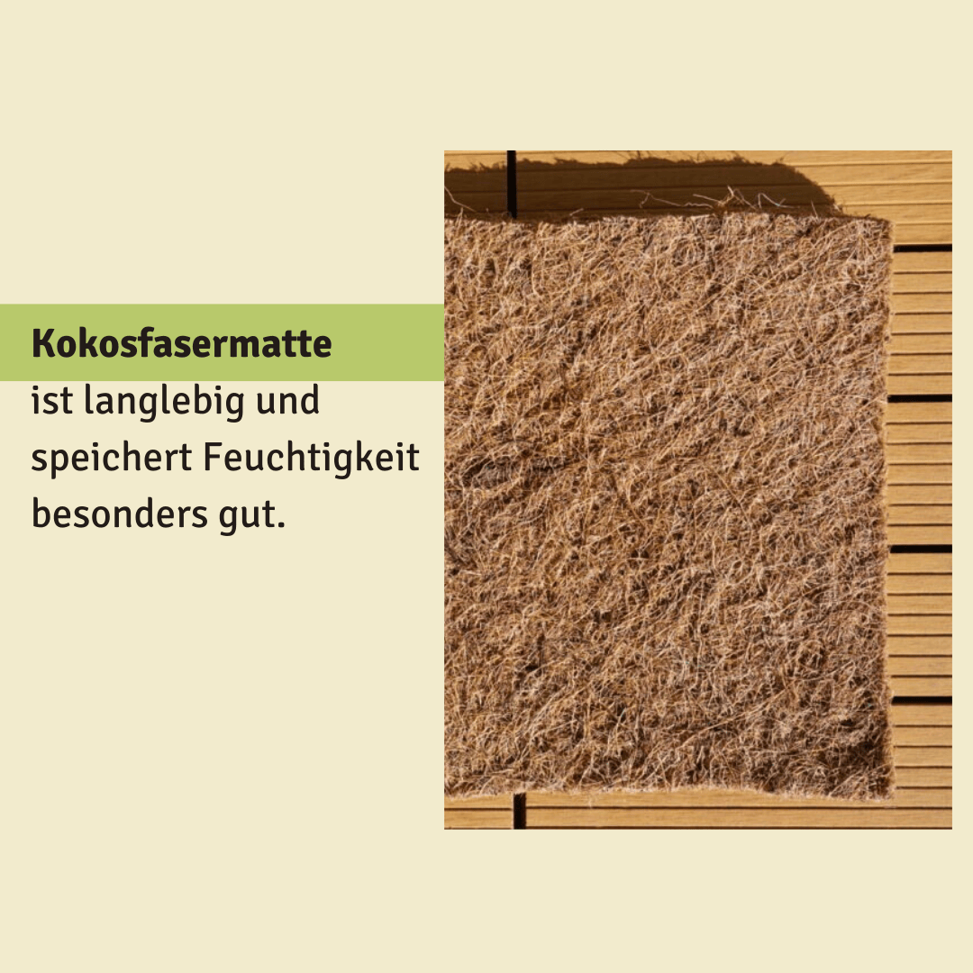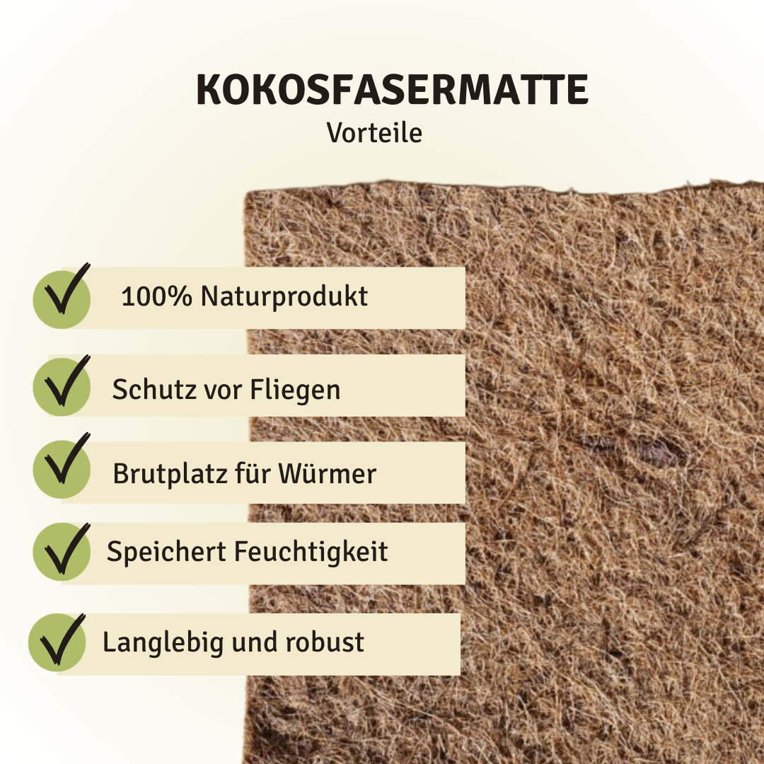 Die Kokosfaermatte speichert Feuchtigkeit, reguliert die Temperatur im Komposter und schützt vor unerwünschten Eindringligen.