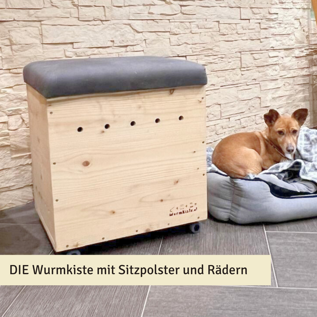 Die Wurmkisten sind aus Holz und für drinnen konzipiert. Die Rollen und der bequemen Sitzpolster verwandeln unsere Wurmkiste in einen dekorativen Sitzhocker. Die Wurmbox fügt sich elegant in deinen Einrichtungsstil -funktional und dekorativ zugleich.