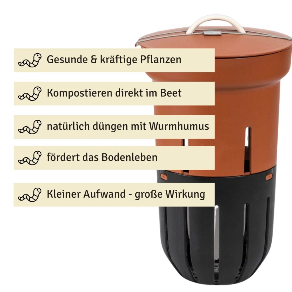 🌿 Natürlich düngen, ohne Aufwand – Die Würmer verwandeln Bioabfälle in wertvollen Humus und verteilen ihn automatisch im Beet. Kein zusätzliches Düngen nötig!