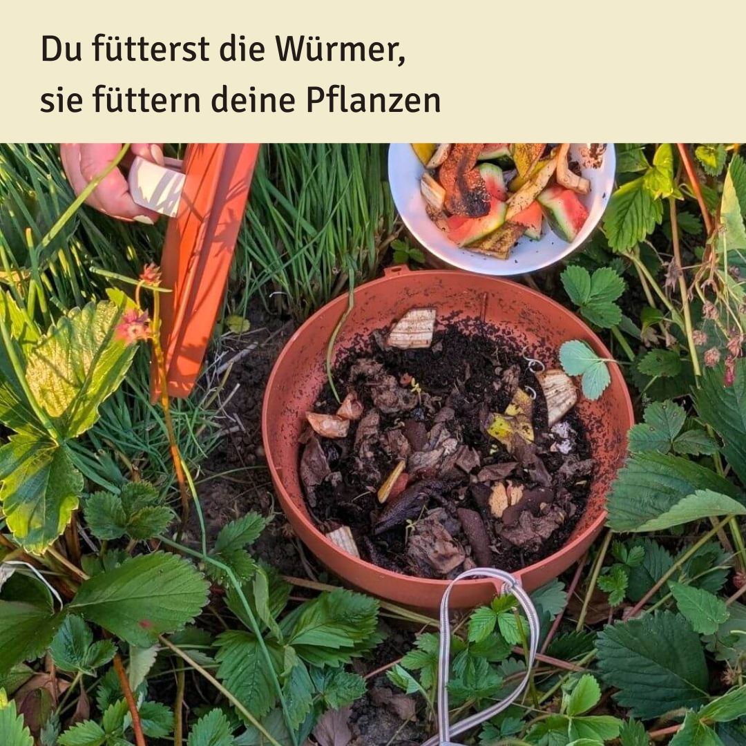 Würmer & Fütterung: Würmer samt Substrat einfüllen und sowohl die WurmBAR als auch die umliegende Erde gut befeuchten. Zu Beginn sollte bereits ein Drittel bis zur Hälfte des Behälters mit Bioabfällen gefüllt werden, damit die Würmer ihre Futterquelle direkt finden. Danach wird regelmässig nachgefüttert, sobald das Volumen sichtbar schrumpft. Die Würmer vermehren sich in deinem Beet selbstständig.