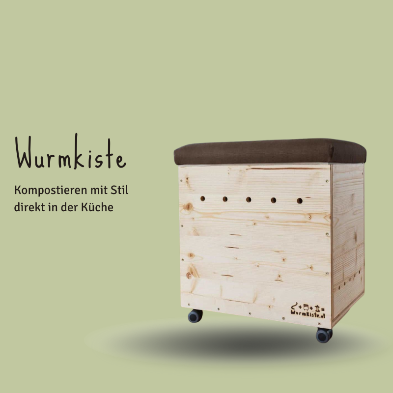 Unsere Wurmkiste mit Sitzpolster dient zugleich als Sitzmöbel – ultra praktisch und schön.